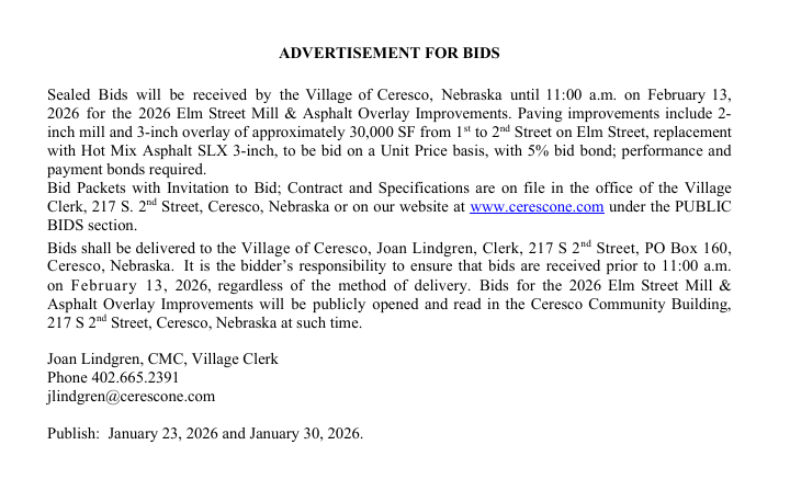 Village of Ceresco217 S. 2nd St.PO Box 160Ceresco, NE 68017